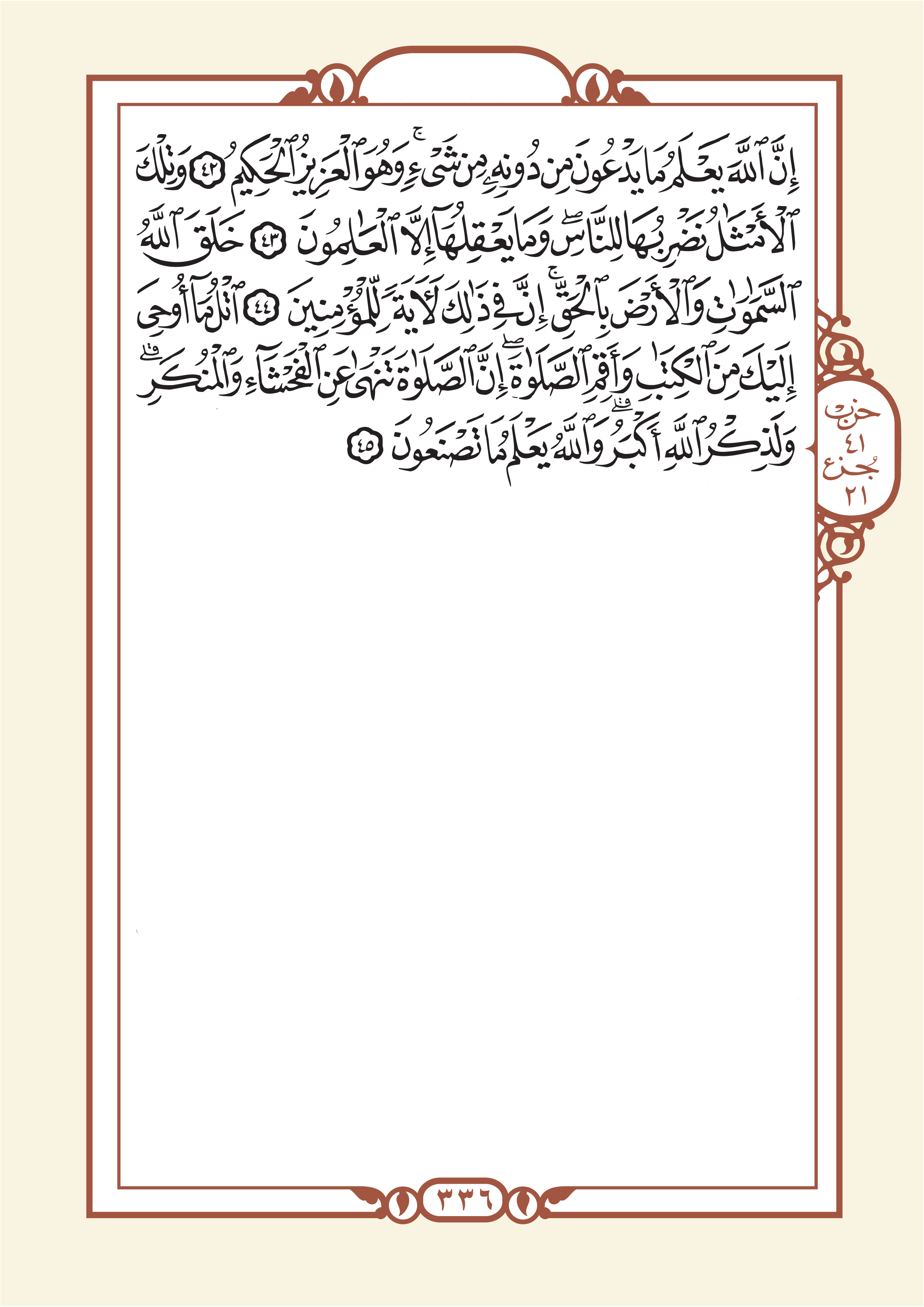 الجزء العشرون: عبارة عن تكملة لسورة النمل آية 56 وينتهي بسورة العنكبوت آية 45.
